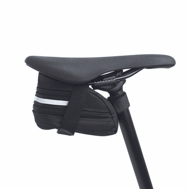 Bolso para sillín de bicicleta expandible con cinta reflectante de alta visibilidad, fabricada en poliéster repelente al agua. Es uno de nuestros bolsos más cómodo para sillín, ya que es un bolso muy versátil, lo podemos ocupar con pocas cosas y si queremos agregar más cosas lo expandimos.