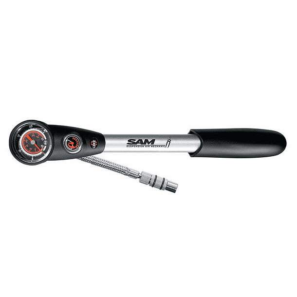 La bomba de suspensión compacta SKS SAM (suspensión neumática mecánica) con una conexión de manguera giratoria (reforzada con una malla de acero flexible) alcanza una presión máxima de 25 bar. La conexión de la válvula Schrader se realiza con un conector roscado de 2 etapas, lo que permite atornillar sin pérdida de presión.